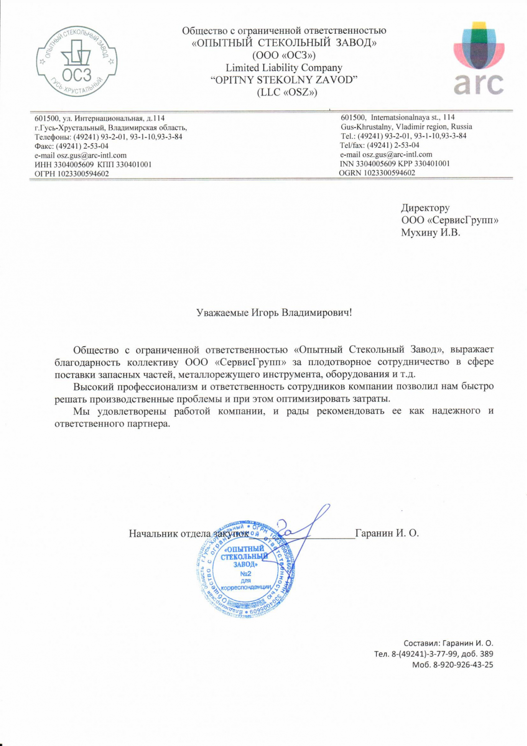 Общество с ограниченной ответственностью "ОПЫТНЫЙ СТЕКОЛЬНЫЙ ЗАВОД" (ООО "ОСЗ")