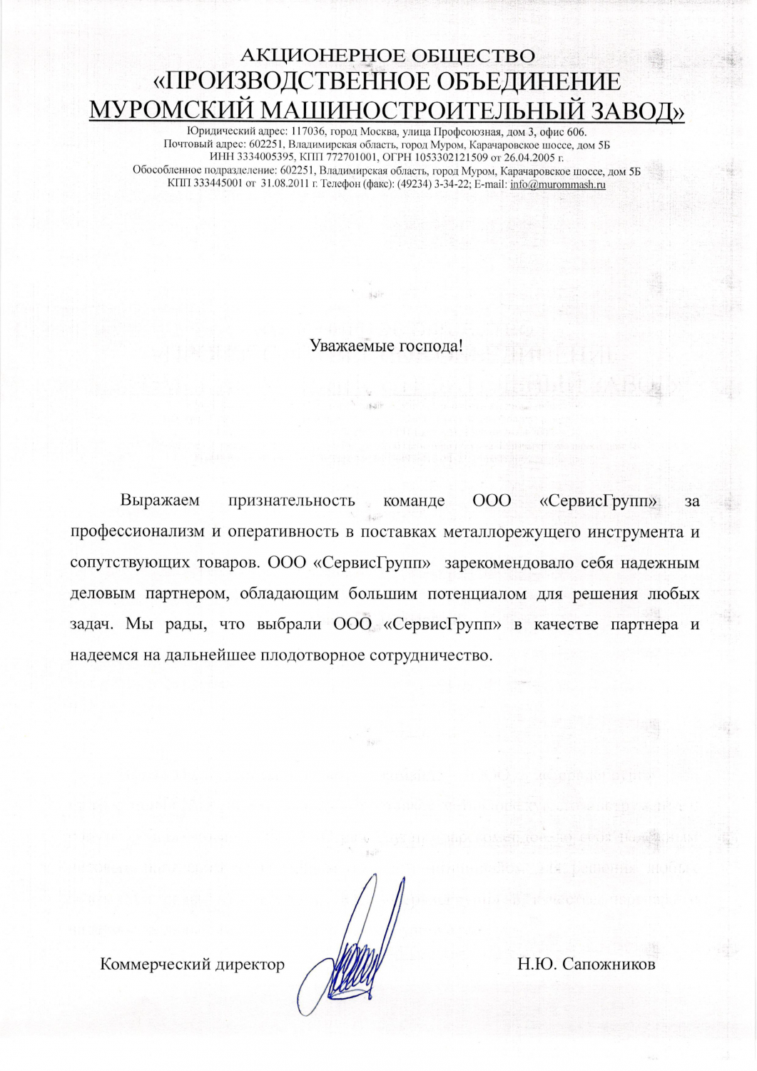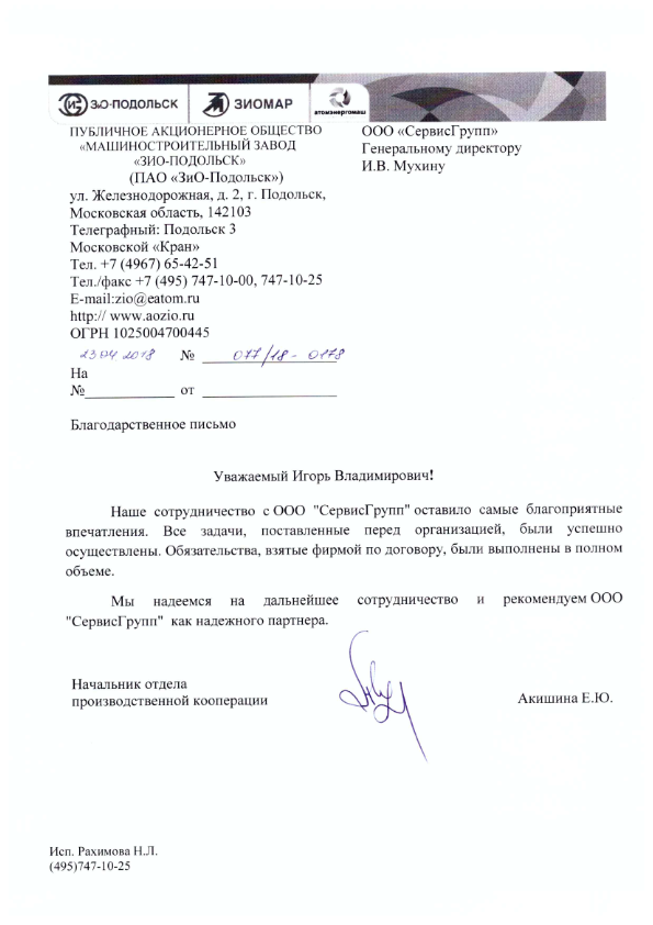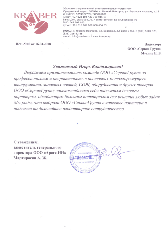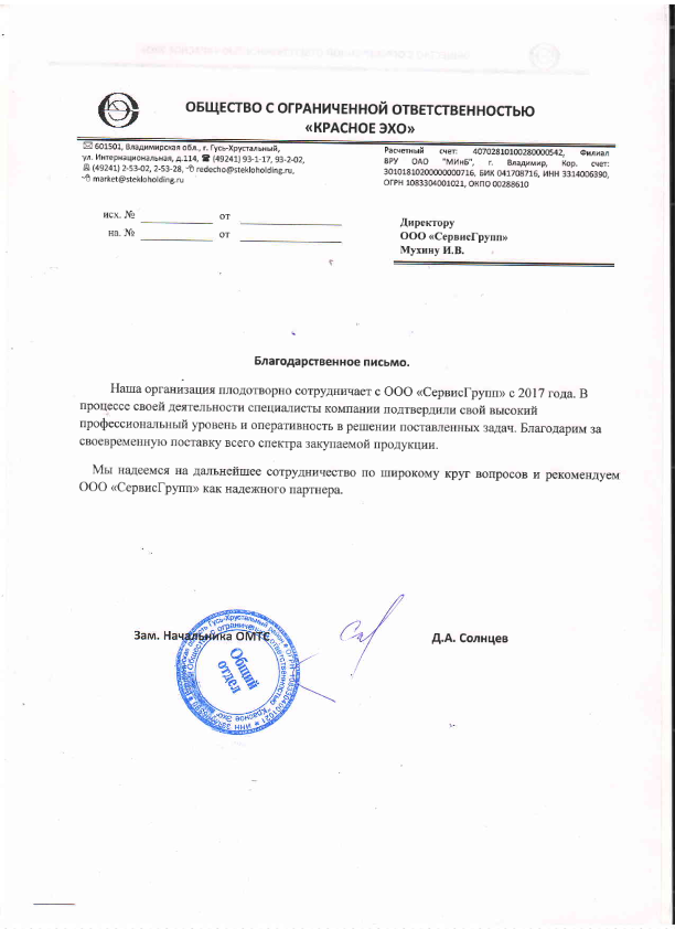 Признательность команде ООО "СервисГрупп" за профессионализм и оперативность в поставках.